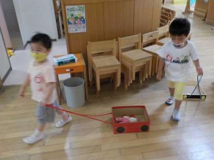 3歳児は,ホールで段ボールの乗り物を運転しています。
