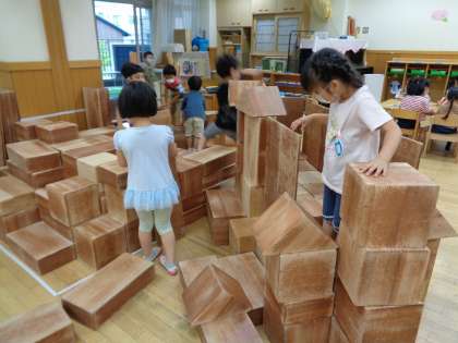 5歳児は,去年の遊びのイメージをしながら,たくさんある大型積み木を組み立てて遊んでいます。