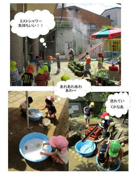 ミストシャワーをいつもより管を長くしていたので,その下で気持ちよさを感じたり,スプリンクラーのくるくる回る水にかかるのを楽しんだり,石鹸で泡泡をつくって感触を楽しんだりしていました。そして,中京もえぎ幼稚園には地下水をくみ上げる大人気のポンプがあるので,そこから樋をつかって水をどうして流そうかといろいろ異年齢で考えて遊ぶ姿もありました。きもちよかったね〜!