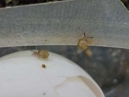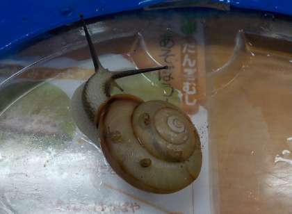 保育室で飼っていたカタツムリの赤ちゃんがうまれました。とても小さなカタツムリの赤ちゃんですが,小さくても形は大人と同じ。