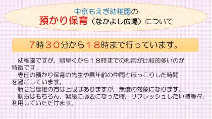 中京もえぎ幼稚園での預かり保育の紹介です。ご不明な点はまた幼稚園の方にお尋ねください。また、未就園児満3歳児さんの預かり保育もこぐま組の時間に実施しています!