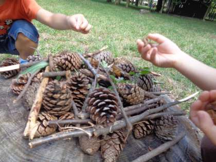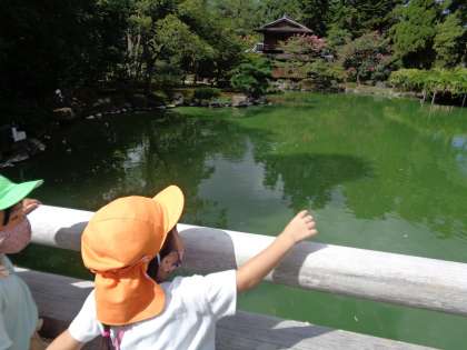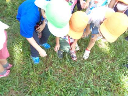 御苑につくと,池にいるカメやコイ,草の間とぴょんぴょん跳ねるバッタやコオロギ,木についている蝉の抜け殻,どこからか聞こえてくる虫の声,松ぼっくりやもみじの葉など,たくさんのものを発見する子どもたち。「見て見て,ここにもいたよ!」「バッタ触ってみたい!」と見つけたものを話したり,先生や友達に見せたりしていました。