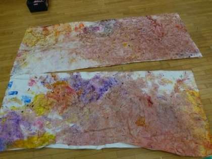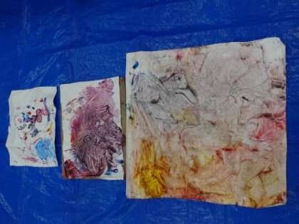 雨が降る前に,朝一番から外にシートを敷き,絵の具とのりを混ぜた感触色遊びを思いきり楽しみました!初めての感触に,最初は少し恐る恐るでしたが,紙にのばしたり先生の手に塗ったりするうちに,「きゃ〜」「見て〜(手が)赤色〜」とヌルヌルの感触や鮮やかな色,混ざって色が変わる面白さを感じ始め,徐々に気持ちを解放させて遊ぶ姿がありました。途中で少し雨がぱらついて足元が濡れたことで,足にも塗り始め,「つっるつる〜」「ぬっるぬる〜」と口ずさみながら紙の上を滑ったり,全身に塗ったりして楽しみました。「緑ほしい」「ピンクも!」という声もあがったので,明日はさらに色を増やして遊びたいと思います。
