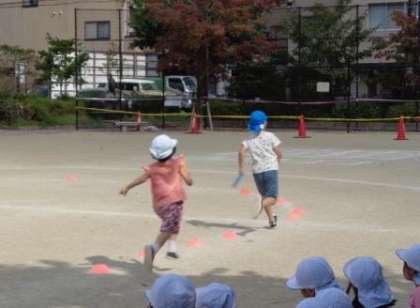 5歳児のゆり組・すみれ組は「今日もリレーする?」と毎日リレーを楽しみにしています。クラス対抗でAチーム・Bチームの2回戦をしています。チームで話し合いをして順番を決めたり,もう一つのチームを一生懸命応援したりと,思いをもって取り組む姿が見られています。力いっぱい最後まで走ってバトンをつないでいく姿が素敵です。気持ちを一つにこれからもリレー頑張ろうね!