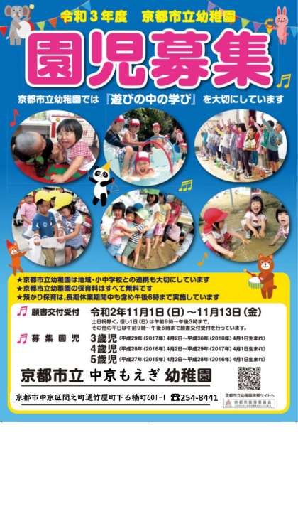 令和3年度の入園の募集を11月1日(日)〜13日(金)に行います。詳しくはポスターをご覧ください。見学希望の方もぜひご連絡ください!