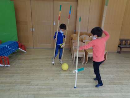 園庭では,3,4歳児のリレー,そして遊戯室では,5歳児の竹馬サッカーが始まっていました。どんどん進化していく遊びに子どもたちの成長がうかがえます。素敵ですね。