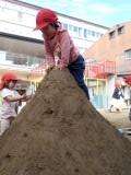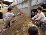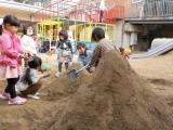 今日は砂場で3歳児のつくる高い高い山と,4歳児のつくる高くて固い山の2つの山ができあがりました。