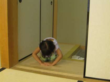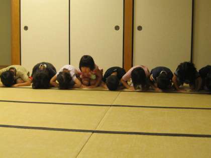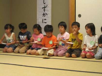 預り保育の時間に、年長児がこどもお茶会に参加しています。1学期中は私が子どもたちを招きます。「はじめのいっぽ」の金平糖からスタートして、15人ずつ程の小グループでどの子どもも3回ずつ和室に来てくれます。扉一枚隔てることで静かな空間があり、走り回っていた子どもたちが穏やかに正座する時間になっています。わずか30分ほどですが、私にとっても子どもたちとゆっくり向き合うことのできる嬉しいひとときです。茶道の作法を学ぶ以前、まず雰囲気を十分味わって欲しいと願っているところです。