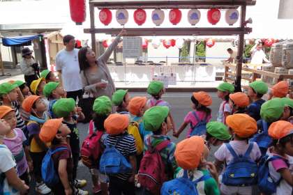 朝からカンカン照りのいい天気!今日は,祇園祭の鉾見学に4・5歳児で出かけました。