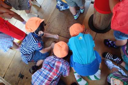 兄弟組(ゆりとひまわり,すみれとたんぽぽ)で手をつないで,長刀鉾,函谷鉾,月鉾,菊水鉾,放下鉾,南観音山を見て回りました。南観音山に乗せてもらって,上から見る景色は絶景!しかし子どもたちは,床に開いている穴をずっと覗き込んでいました。