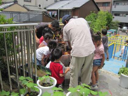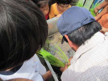 園児の祖父の方から、稲の苗をいただきました。狭い園庭なので、ほんの少ししか育てられないのですが、通路にベビーバスなどを置いて育てることになりました。「お米になんの?」「お米てご飯のこと?」「いつできんの?」興味いっぱいに子どもたちが寄ってきました。「秋、運動会も済んでからきっとできるよ」と教えてもらいました。おもゆ程度は収穫できるかもしれません。ありがとうございます。それまでちゃんと育ちますように、よろしゅうおたのもうします。