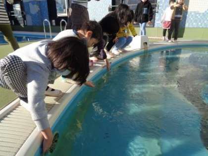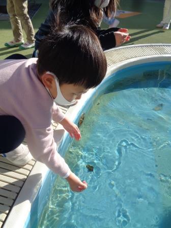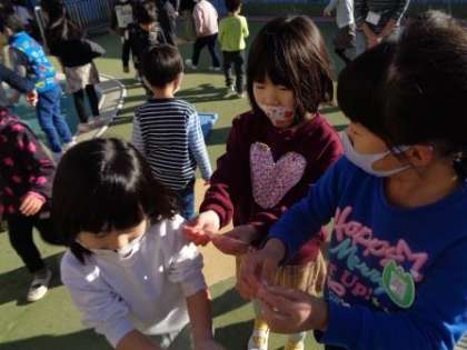 見つけた子どもたちが「プールに氷ができてる!」と,元気いっぱい知らせる姿がありました。その声を聞き,プールへ行くと,浅い小さなクジラのプールに氷が!「氷できてる!」と嬉しそうに触ってみたり,持ってみたりする姿がありました。そして,氷やプールの水の冷たさを感じたり,氷を透かしてのぞいてみたり,氷に氷を投げて割れ方や音を感じたり,様々な楽しみ方をしていました。
