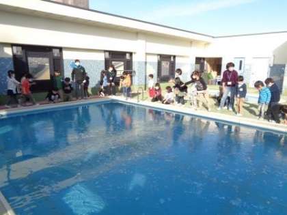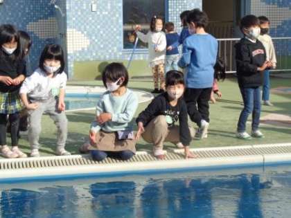 前回は小さなプールだったのですが,今回は大きなプールに氷がはっていて,そのことを見つけた子どもたちは,再び「氷ができてる!」とみんなに知らせて回っていました。