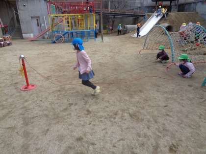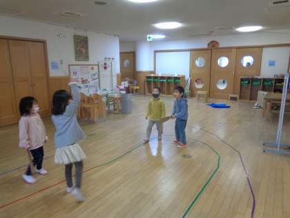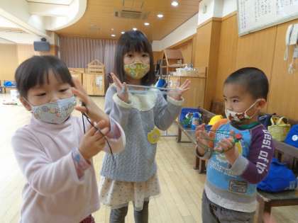 お正月を感じる遊びを楽しんでいます。大縄をしたり,あやとりをしたり,羽根つきをしたり,体や指を使って,存分に楽しんでいます。