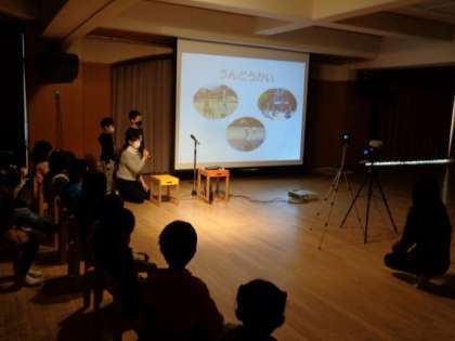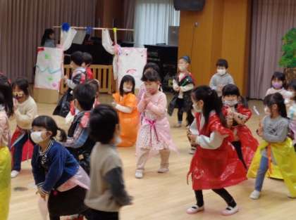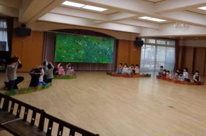 子どもたちは朝から張り切って登園し,「今日は発表会」と楽しみにする姿がありました。お客さんの子どもたちや教職員が見守る中,緊張感をもちながらも歌や遊び,劇遊び,紙芝居を楽しんでいました。なりきって遊ぶことを楽しんだり,自分の思いを一生懸命伝えたりと,友達と力を合わせる素敵な姿がたくさん見られました。