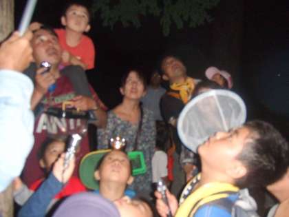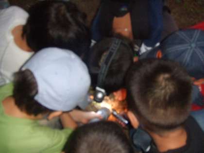 だんだん辺りが暗くなってくると、土の中から出てきた幼虫たちが、木を登り始めました。「この幼虫がピタッと止まったら、羽化をするから触らないで見てようね!」と約束をしました。子どもたちは木に登る幼虫を採っては、「これは、クマゼミかな?」と言ったり、「家に持って帰りたい」と言ったりしていました。しばらく幼虫に触れたり採ったりして遊んでいると、「あっ、あの葉っぱについてる幼虫の体がだんだん割れてきてる!」と羽化をしようとしているセミの幼虫を発見しました。子どもも大人も皆、目をじっとこらしてその様子を見ていました。「頭が出てきた!」「あっ、羽を少しずつ広げようとしてる」「すごい!マヨネーズみたいな色してる」とゆっくり、ゆっくり茶色い幼虫の服を脱ぎ、セミに変身しようとしている姿を感動しながら見ました。
