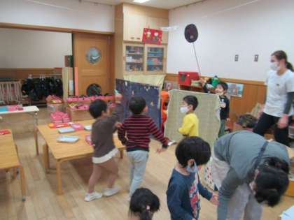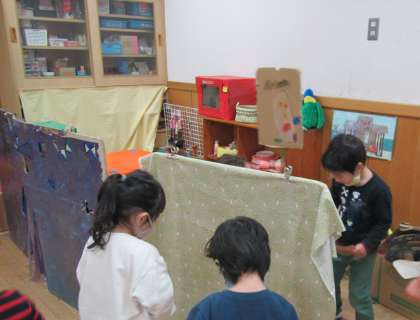 今日の3歳児の様子。今朝クラスのポストを見てみると,忍者からの巻物が届いていました。みんなで中身を見てみると,どこかにお宝が隠されているとのこと。子どもたちはあっという間にお宝の包みを見つけ,開けてみるとピカピカの手裏剣が入っていました。これまで手裏剣でたくさん遊んできた子どもたちは大喜び!「私のはこんな色だよ」と大事そうに手にもって見せてくれる姿や,「これを投げたら痛いんだよ〜」とお化けの的に向け投げて遊ぶことを楽しむ姿がありました。忍者さんまた来てくれるといいね!