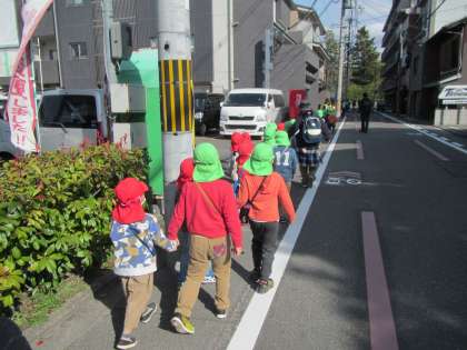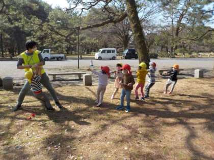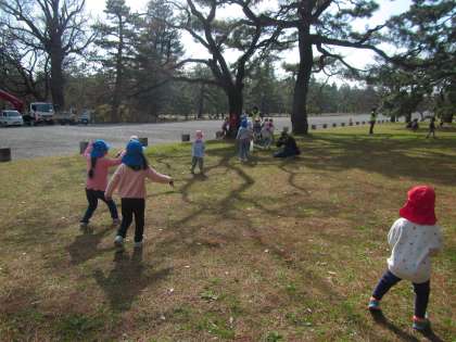 今日は,年長児と一緒に行く最後の遠足に,全学年そろって京都御苑まで行ってきました。年少児も年中児も前日から「年長さんと何して遊ぼう」「氷鬼がいい!」「だるまさんがころんだは?」とわくわく。すみれ組ともも組,たんぽぽ組とひまわり組,ゆり組とちゅうりっぷ組で手をつないで並び,年長児は年少児のことを考えながら,白線の中を車に気を付けて歩いてくれました。