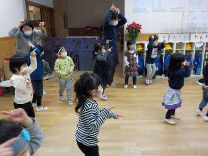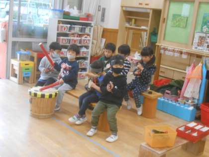 今日はなんと,3歳児もも組とちゅうりっぷ組の間の壁が開いて,2クラスが行き来できるようになりました。子どもたちは「もも組にあんな遊びあるで!」「ちゅうりっぷ組に行ってみよう」と,忍者の家や飴屋さん,レストラン,コンサート,お雛様の変身グッズなど,楽しい遊びが盛り沢山の互いのクラスに興味津々で遊びに出かけます。2クラスの真ん中には,どちらのクラスでも楽しんでいるコマがあり,個人のコマやいろいろな種類のコマ・回し方を見せ合って楽しんでいました。