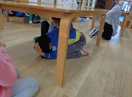 放送を聞いて,体を丸めて頭を守る『だんごむしのポーズ』をしながら机の下に避難したり,先生の話を聞いて,地震が起きるとどうなるのか,どこに避難したら良いか考えたりしました。「ロッカーが倒れてくるから離れなきゃ」「積み木も危ないよ」「上から物が落ちてくるかも」とたくさん考えて話す姿がありました。