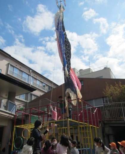 5歳児の子どもたちがこいのぼりをあげている様子を4歳児の子どもたちが総合遊具の上から見たり,3歳児の子どもたちも「僕もやりたい!」と興味をもったりする姿がありました。またこいのぼりをあげて楽しもうね!