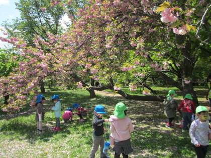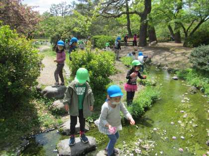 たくさんのタンポポや桜を見つけて集めたり,生き物を探したり,広場で鬼ごっこをして遊んだりすることを楽しみました。出水の小川では,水に手をつけて冷たさを感じたり,花びらが浮かぶ様子を見て「きれいだね」と友達と話したりして,春の自然に触れてたくさん遊びました。