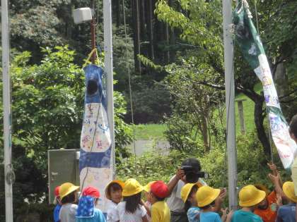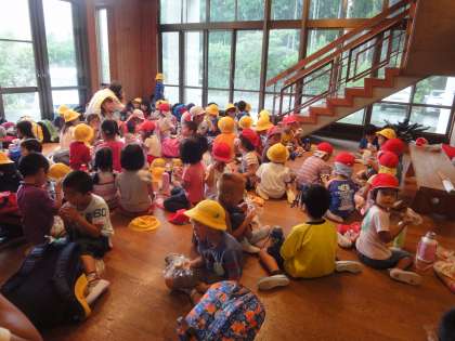 8月26日 京都バスに乗って間之町御門を出発!バスの中では,歌を歌ったり,ゲームをしたりして楽しい時間を過ごしました。 花背に到着すると,まずは入所式を行いました。白グループさんが,クラス旗をあげるお手伝いをしてくれました。その後,雨が降ってきたので,室内でおにぎりを食べました!!