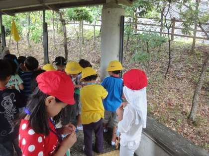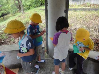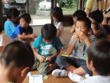 おにぎりを食べた後は,館内ウォークラリーを行いました。(天気が良ければ川遊びだったのですが・・・)グループごとに分かれ,10個の動物マークか果物・野菜マークを見つけに館内を探検に出発しました!手すりやテーブルの下など「えっ,こんな所に?!」と思うような所でマークを発見し,大喜びの子どもたちでした。全グループがゴールすると,冷たくておいしいフルーツゼリーを食べました!