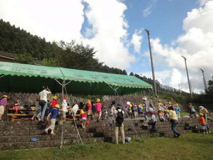 ウォークラリーが終わり,外を見ると雨があがっていました!せっかくなので,川までお散歩をしにいくことにしました。山道をあるいていると「ちょっと涼しいね」「あ〜,なんかにおいが違うなぁ」「あそこにカエルがいる!」などと言う声が聞こえてきました。川に到着すると,早速,川の水に手をつけて「キャー!冷たい!」と自然の川の水の冷たさを肌で感じる姿が見られました。
