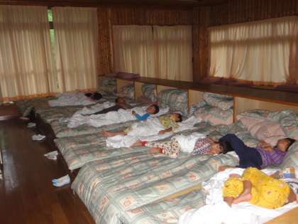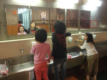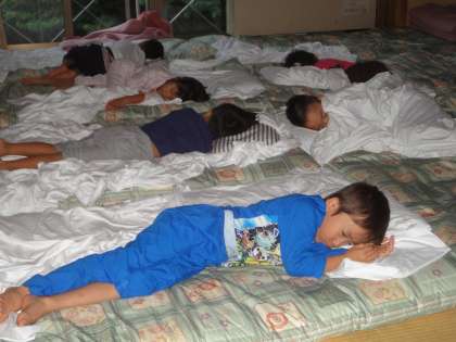 キャンプファイヤーが終わると,歯を磨いて寝る時間になりました。お家の人と離れて初めてのお泊り保育!この時間が一番子どもたちにとってドキドキする時間だったのではないでしょうか?初めは「絶対に寝ないぞ」「全然眠たくないわぁ」と言ってた子どもたちも,友達が一人,二人と眠りだすと,だんだん眠たくなってきて様子でした。先生も,普段は子どもたちの寝顔を見ることはできないので,お泊り保育で子どもたちのかわいい寝顔をみることができ,とても幸せな気持ちになりました。