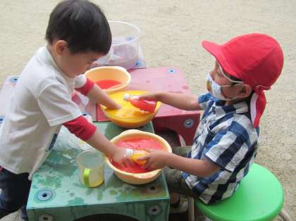 園庭の総合遊具では,最近毎日のように,5歳児年長組の子どもたちが一生懸命何かに挑戦しています。見ると…登り棒です!!裸足になって上を目指して頑張る姿がとってもかっこいいです。少し苦しいときは先生に助けてもらいながら,全身を使って登っています。隣では同じように頑張る友達の存在があり,下では頑張っている仲間を真剣に見つける友達の存在があり,ますます力が湧いてきます。また,鉄棒では,4歳児年中組の子どもたちが「先生見て!」といろいろな回り方やぶら下がり方などに挑戦しています。そして,3歳児年少組の子どもたちは連日色水遊びに夢中です。「赤ちょうだい!」「緑になった!」と,水の気持ち良さを感じながら遊んでいます。