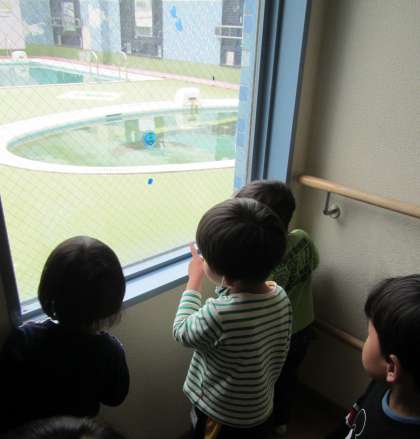 また,もも組ちゅうりっぷ組の部屋以外にも4歳児の部屋までフープ電車に乗って探検に出かけたり,階段を上がって二階の部屋や遊戯室,屋上プールにも先生と一緒に足を運び,新たな楽しそうな場所を発見して何度も繰り返し探検したりしていました。