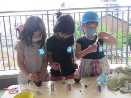 テラスでお花の花びらで色水をつくることを楽しんでいた子どもたち。