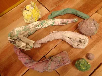 本を見ていて「これつくりたい」と伝えてきたA児と共に,新聞やキラキラの紙でいろんな形をつくりました。形ができると「色を塗りたい」と「絵の具で塗りたい」と話すので,絵の具の準備をしていました。すると,他の子どもたちもやってきて「一緒にしたい」と遊び始めました。新しい友達が来たことでイメージが膨らみ,色々な色を使いたくなった子どもたちは「青ほしい」「緑も」と,どんどん思いを伝えてくれました。色が塗れたものは,今大事に乾かしています。。