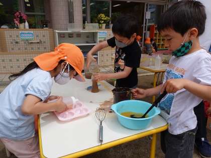 花びらや葉っぱをすりつぶして使ったり,絵具の水を使ったりして,遊んでいます。