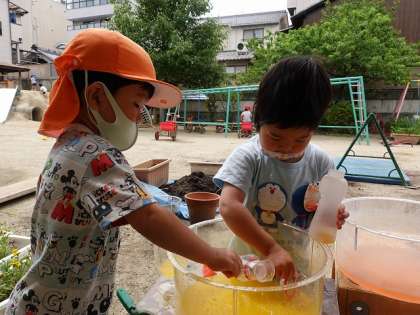 色の水で遊んでいます。(4歳児)