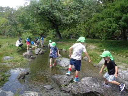 今日は5歳児が京都御苑に散歩に行きました。公道を歩くのもとても上手になっています。出水の小川につくと,木陰がとても涼しくさわやかでした。子どもたちは早速川に入って遊んだり,鬼ごっこをしたり,そしてとても立派な梅の実を見つけたりしていました。楽しかったね。