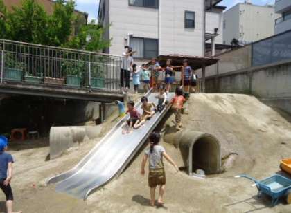 午後からは4歳児・5歳児の子どもたちが滑り台の上から水を流して滑るウォータースライダーを楽しんでいました。「わー!」と歓声をあげながら友達と滑る子どもたちは笑顔いっぱいでした。