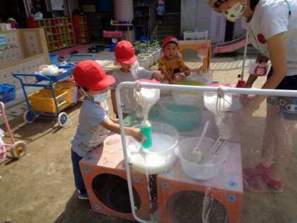 色水遊びでジュースづくりを楽しんでいる3歳児の子どもたち。ペットボトルでつくった装置に泡を流してアイスクリームがつくれるようにしていると,お玉で泡を入れて「トロトロ出てきたよ!」「メロンジュースにアイスのせたよ」とおもしろさを伝える姿が見られました。