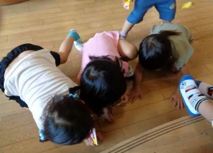 外の探検では,ザクロの花が落ちているのを見て「たこさんウインナーが落ちてた!」と大発見。みんなで探しに行き,見つけた花を大事に保育室の宝箱に集めています。ダンゴムシやヤスデなど生き物にも出会って嬉しそうにしている子どもたちでした。また来週も探検しようね!