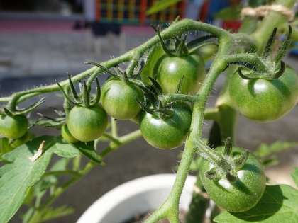 1枚目は,4歳児がクラスで育てているミニトマトです。たくさん花が咲いて,青い実が生ってきました。少しずつ色が変わっていくのが楽しみです。