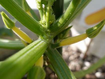 3枚目は,なんだと思いますか?これは,ズッキーニです。上を向いています。少しずつ大きくなってきましたよ。