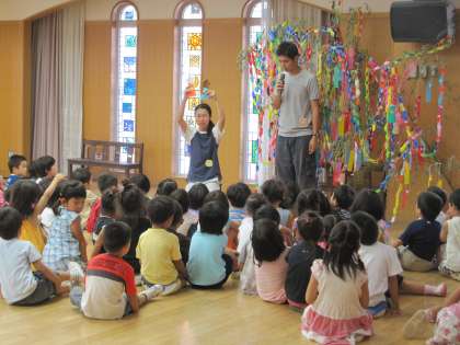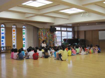 各学年で七夕の集いをしました。織姫星、彦星の話を聞いたり歌をうたったりして、星にちなんだ菓子を一口みんなで食べました。今夜は夜空が見られるでしょうか?夢の中ではみられるかもしれませんね。