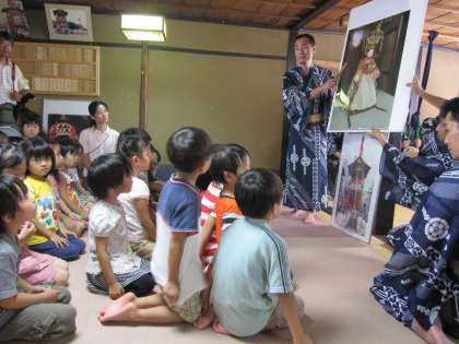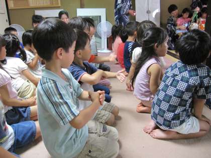放下鉾のお囃子を親子でききにいきました。学校運営協議会のお世話になり毎年実施していただいています。町会所の二階に上げてもらい、鉾の話をきいたり、ほんの近くで本物のお囃子を聴かせていただきます。鉦を交代で鳴らさせてもらい、緊張のうちにも楽しいひとときを過ごします。思わず、囃子方のまねをする子どもも出てきたりしました。幼稚園から出かけるときは、あいにくの雨になりましたが、さすがに年長児、簡易レインコートを着て黙々と急ぎ足で歩きました。よくがんばったと思いました。臨機応変にできるようになっていることも嬉しい収穫の一日でした。こんどは鉾たて見学です。今を、夏を、地域をいっぱい感じている子どもたちです。