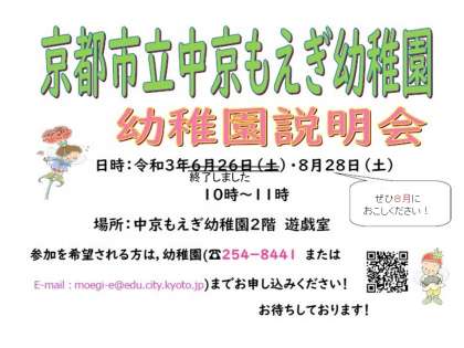6月26日(土)に幼稚園説明会を行いました。午前の部・午後の部に分かれて,たくさんの方にご参加いただきました。ありがとうございました。幼稚園の大切にしていることなどお伝えすることができ,大変喜んでいます。ご都合の合わなかった方等,また8月28日(土)10時より,同じ内容で説明会を行いますので,電話やメール moegi-e@edu.city.kyoto.jp でお申込みいただき,ぜひご参加ください。随時見学も受け付けていますので,幼稚園までご連絡くださいね。
