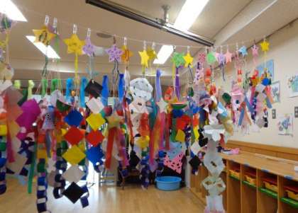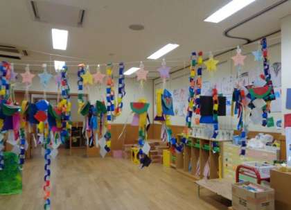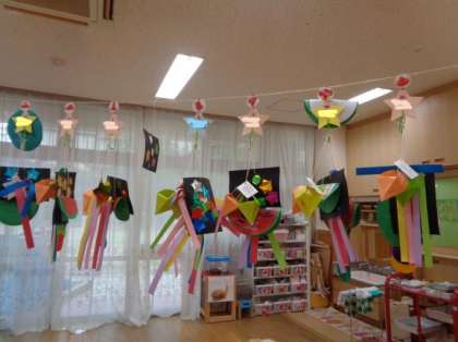「もっとつくりたい」とどんどん飾りが増えていき,保育室が素敵な七夕飾りでいっぱいになってきています。
