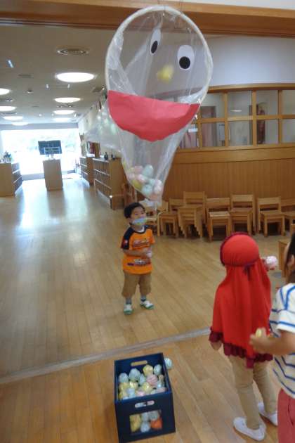 3歳児の保育室では,大積み木を自分で運んできて好きな形に構成し,乗り物など自分なりのイメージで遊ぶことを楽しんでいます。一人が「バスつくる!」とつくり始めると,横で同じように真似てつくる姿があります。トントントンと,トンカチに見立てた物を手に持って「工事中です」「バスできました〜」と思い思いに遊んだり,友達と一緒に「発車しま〜す!」と,二人,三人乗りを楽しんだりしていました。「お化け駅到着!」と,降りた目の前には,お化けのばけたくんが大きな口を開けて待っています。先日から,ばけたくんにごちそうをあげようと,おやつのボール投げも楽しんでいます。狙って投げる顔は真剣で,入ると「やったー!」大喜び。日に日にコツをつかんで投げ入れるのが上手くなってきました。
