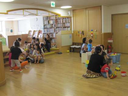 入園前の2歳児さんの親子登園の日を毎月1回設けています。午前10時から11時、園児のいる時間帯にきてもらい、親子で遊んだ後、その月に生まれた子どもの誕生会をしています。在園児が誕生日の歌を歌って祝ってくれます。1学期は7月7日が最後でした。七夕さまの歌を歌ったり飾りをつくったりしました。登録制ですが参加は随時受け付けています。どうぞ遊びにきてくださいね。お待ちしています。