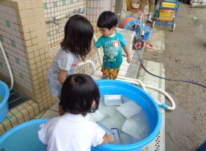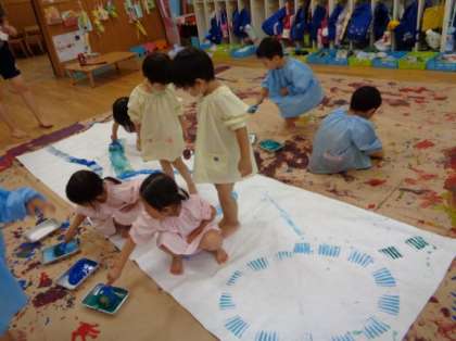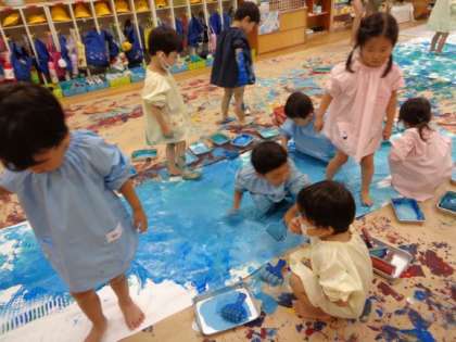 雨が続いてプールに入ることができませんでしたが,今日は絵の具で大きなプールをつくりました。手や足,スポンジやローラーも使って青や水色,緑,白,黄色などの色を混ぜて遊びました。「こんな色になったよ」と混ざった色を見せたり,「つるつるする」と手や足で絵の具の感触を感じたりと,全身で絵の具遊びを楽しみました。