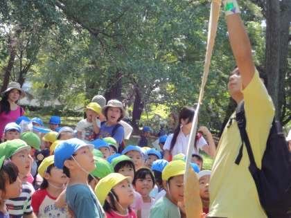 昨日の御苑への園外保育で,きのこの生えた木の下で忍者の巻物が落ちていました!そこには,「もえぎでだいじな おとした」とかいてあり,間の部分が破れていて何を落としたか分かりませんでした。